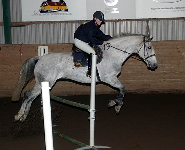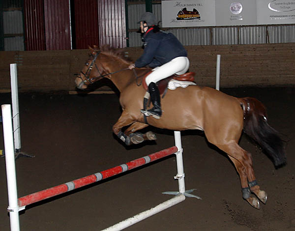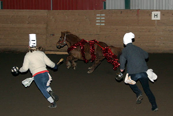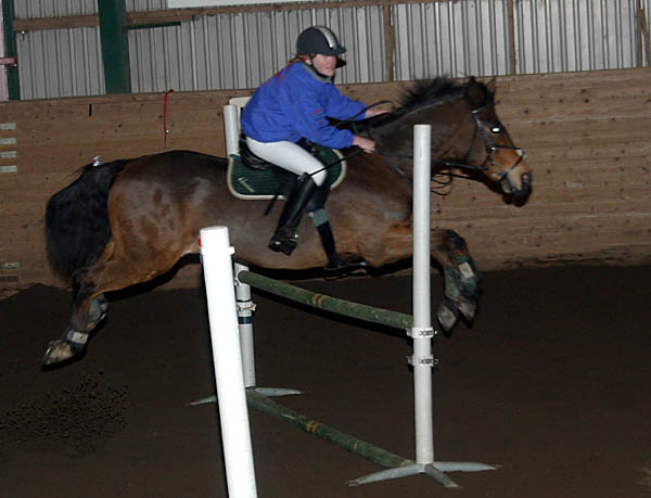 ![]() Lagtävling i hoppning på tid. Gymnasisterna mot ponnyryttare. Ponnylaget vann. |