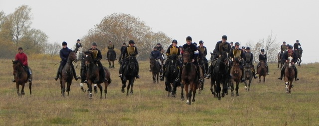 Hubertusjakt 2010-10-30 Lördagen den 30 oktober anordnade Wendes Ridande Batteri den årliga återkommande "Hubertusjakt på Wendes Rinkabyfältet". Vädret var perfekt för arrangemanget denna höstdag. Från VHF deltog Klara, Emmelie och Bo-Rune i tävlingen om den mycket åtråvärda rävsvansen. Tävlingsarrangörerna var överraskade över alla bilåkande åskådare, som tagit sig till det gamla militära övningsfältet. Tävlingen gick stundtals i ett mycket högt tempo. Ett av momenten reds nere i vattnet. Några ryttare var tvungna att byta sina genomblöta kläder i pausen. Våra deltagare var nöjda med dagen, men någon svans fanns ej med till Vellinge. På bilden finner du Klara som nr 2 från vänster. Bo-Rune i högerkanten. Emmelie, på Faustus, trängs undan av kavaleristen, tredje ekipage från vänster. Åke |